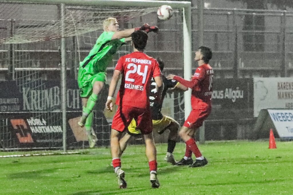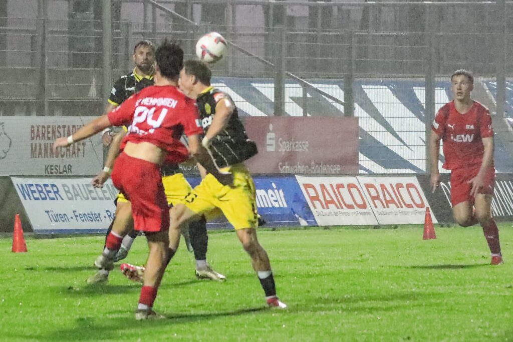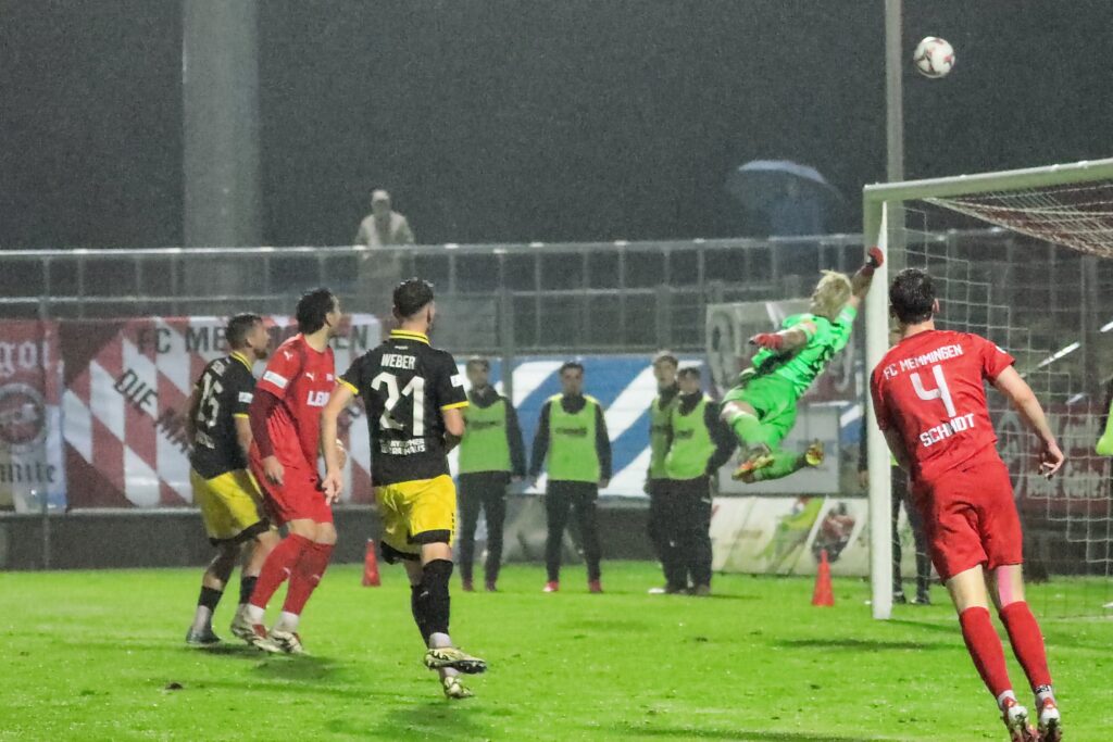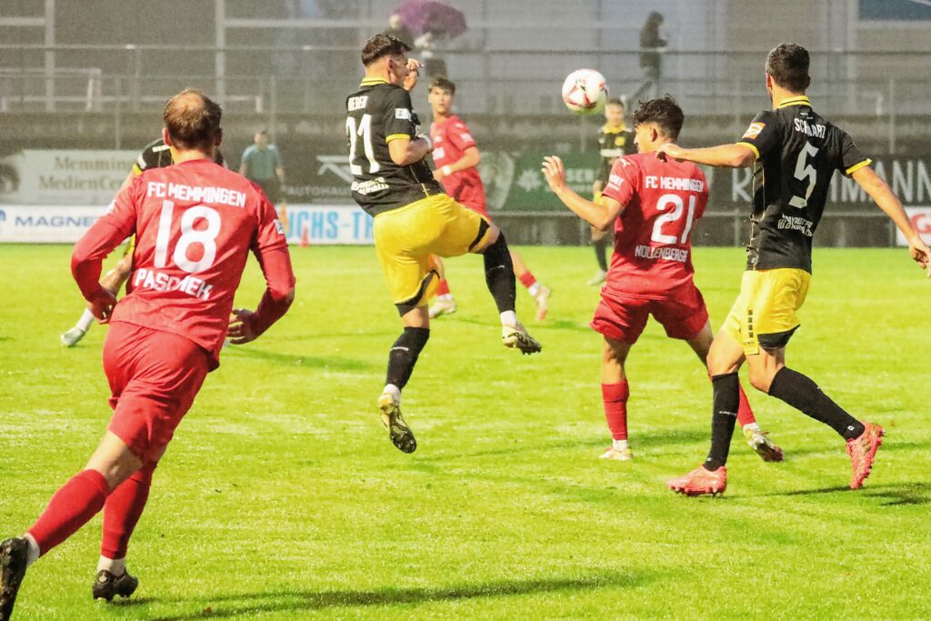 Hatte der FC Memmingen am Wochenende noch bei 30 Grad im Betonkessel des Augsburger Rosenaustadions beim TSV Schwaben gekickt und mit 3:1 gewonnen, war der Wettersturz auch eine Herausforderung. Im Dauer-Nieselregen weichte der Platz zusehends auf und die Spielfeldmarkierungen mussten auf Anweisung von Schiedsrichter Assad Nouhoum (Oberweikertshofen) kurz vor dem Spiel und in der Halbzeitpause von den Stadionwarten nachgezogen werden.
