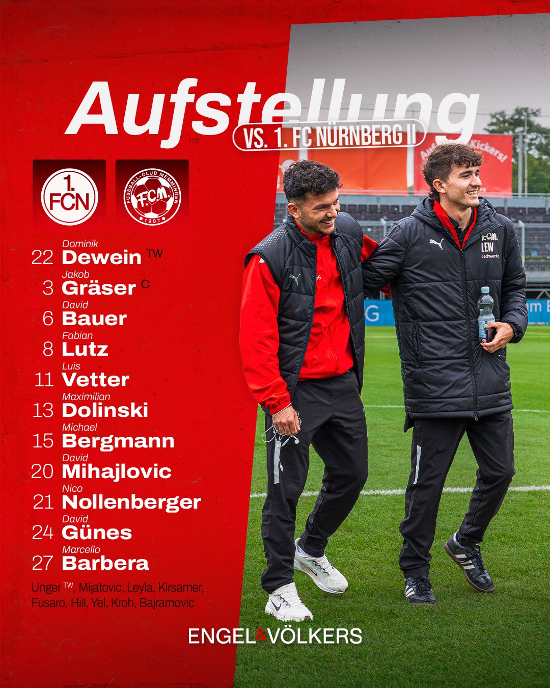 FC Memmingen: Dewein – Dolinski, Gräser (C), Bauer, Barbera (46. Yel) – Lutz, Bergmann, Mihajlovic (75. Kirsamer), Vetter (88. Hill) – D. Günes (80. Mijatovic), Nollenberger (59. Fusaro).
