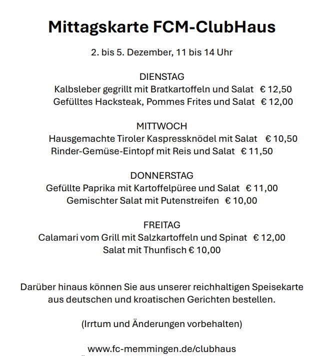 Mittagessen? Von Dienstag bis Freitag bietet das ClubHaus des FC Memmingen täglich wechselnde Mittagsgerichte an. Unsere Wirtsleute Almira & Mario freuen sich über Ihren Besuch natürlich auch abends und am Wochenende!