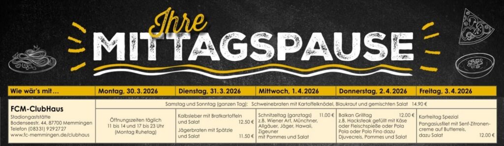 Auch in der Karwoche gibt es wieder von Dienstag bis Freitag ein abwechslungsreiches Mittagsangebot im ClubHaus des FC Memmingen. Am Mittwoch ist sogar ganztags Schnitzeltag, am Donnerstag Balkan-Grilltag und am Karfreitag gibt es natürlich Fisch auf den Tisch.