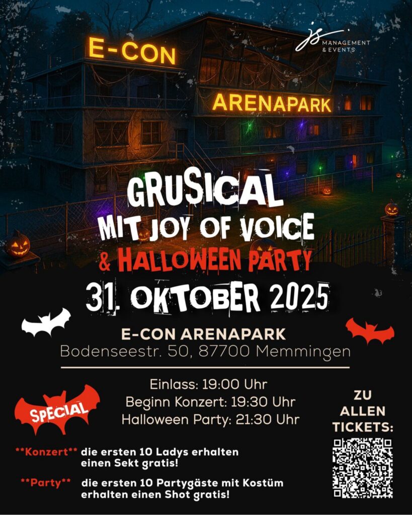 Das Showensemble „Joy of Voice – STAGE ART“ lädt am Freitag, 31. Oktober, wieder zu einem schaurig-schönen Grusical-Konzert und anschließender Halloween-Party in den e-con ArenaPark ein.  Sängerinnen und Sänger, Tanz und gruselige Kostüme versprechen einen schaurig-schönen Abend. Wenn die letzte Note des Grusicals verklungen ist, beginnt die Party hoch droben in der Panorama-Lounge.. Im flackernden Kerzenlicht tanzen Vampire mit Hexen und die Schatten schleichen durch die Menge.