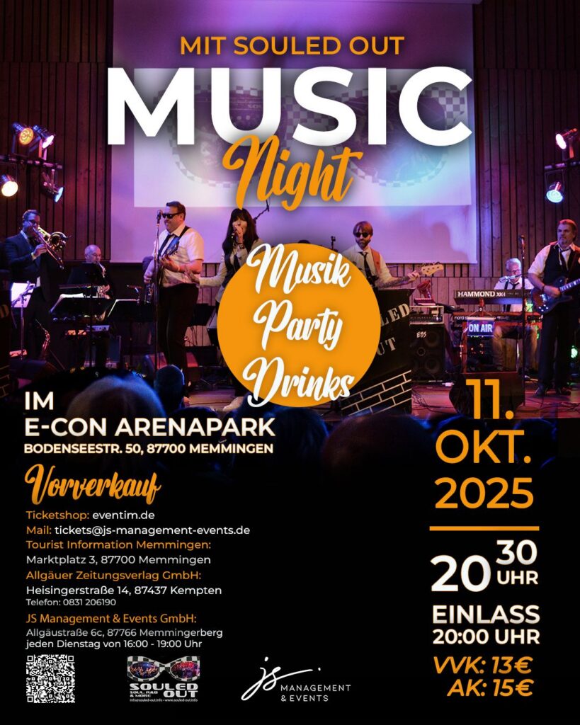 „Souled Out“ – ist eine Coverband aus dem Raum Memmingen/Leutkirch, die sich ganz dem Soul, Funk, Rhythm & Blues und ähnlichen Verdächtigen verschrieben hat. Mit einer Menge guter Laune für einen mitreißenden Abend am Jahrmarktssamstag, 11. Oktober, gibt es zum zweiten Mal im e-con ArenaPark einen musikalischen Querschnitt mit Songs von den 1950iger Jahren  bis in die Neuzeit.