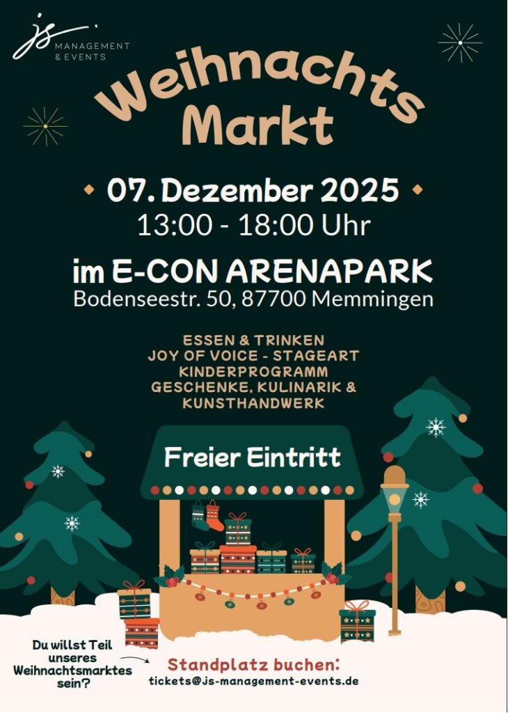 Lassen Sie vorweihnachtlich einstimmen beim Weihnachtsmarkt am 7. Dezember von 13 bis 18 Uhr auf allen Ebenen im e-con ArenaPark Finden Sie passende Geschenke, Dekoartikel und Kunsthandwerk an den Ständen im stimmungsvollen Ambiente. Musikalisch unterhalten Sängerinnen und Sänger von „Joy of Voice – STAGE ART“. Es gibt ein Kinderprogramm und natürlich Essen und Getränke. Der Eintritt ist frei!