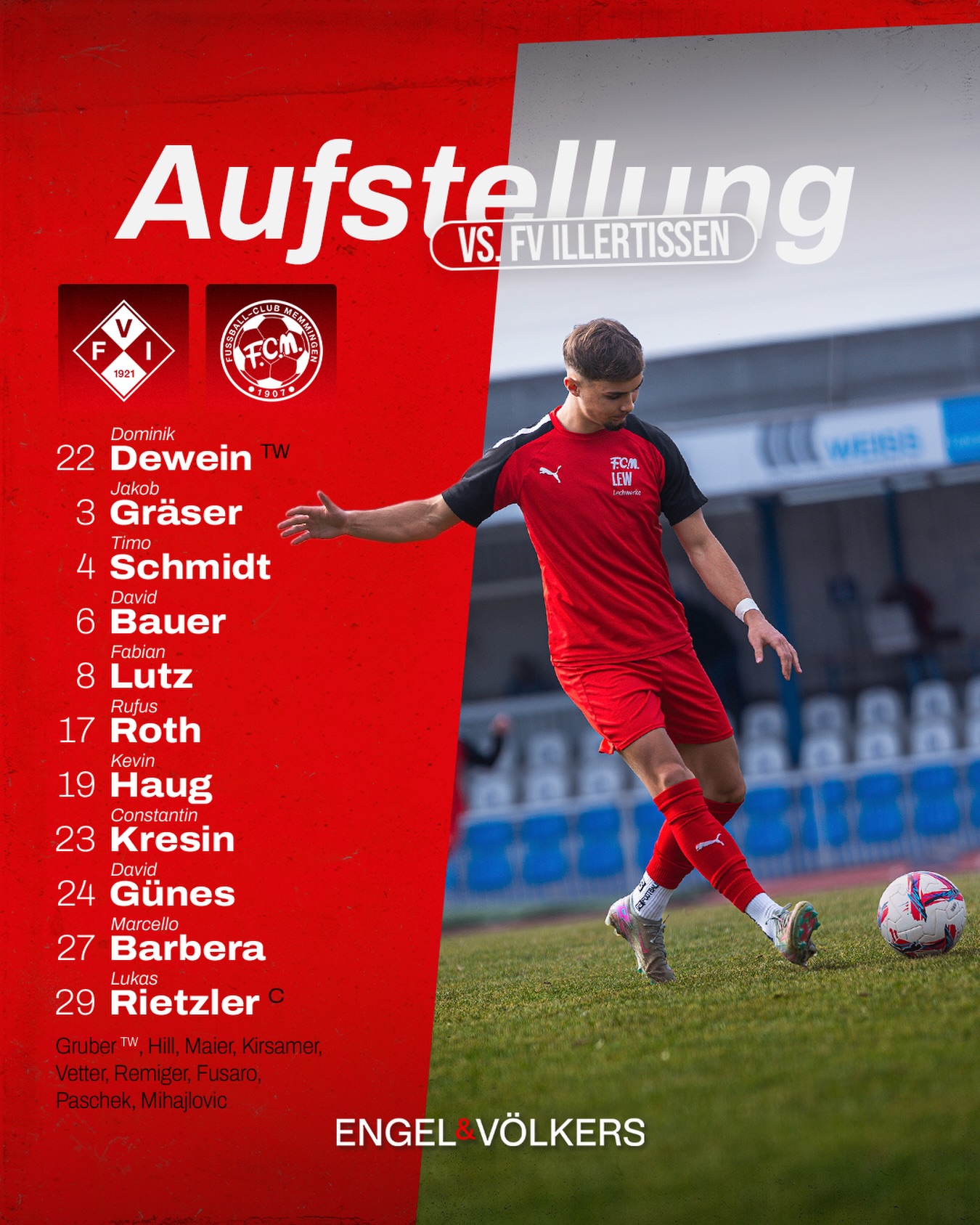 FC Memmingen: Dominik Dewein – Rufus Roth, Jacky Gräser, David Bauer, Timo Schmidt – Marcello Barbera (46. Pascal Maier), Fabian Lutz, David Rietzler (39. Kim Paschek), Constantin Kresin (70. Luan Fusaro) – Kevin Haug (46. Philipp Kirsamer). David Günes (80. David Mihajlovic).