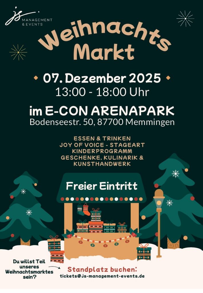 Am Sonntag, den 7. Dezember 2025, verwandelt sich der e-con ArenaPark in Memmingen von 13:00 bis 18:00 Uhr in ein winterliches Weihnachtswunderland. Unter dem Motto „Kommen. Staunen. Genießen.“ lädt der stimmungsvolle Weihnachtsmarkt Besucherinnen und Besucher zu einem besinnlichen Adventsnachmittag voller Genuss, Musik und festlicher Atmosphäre ein.